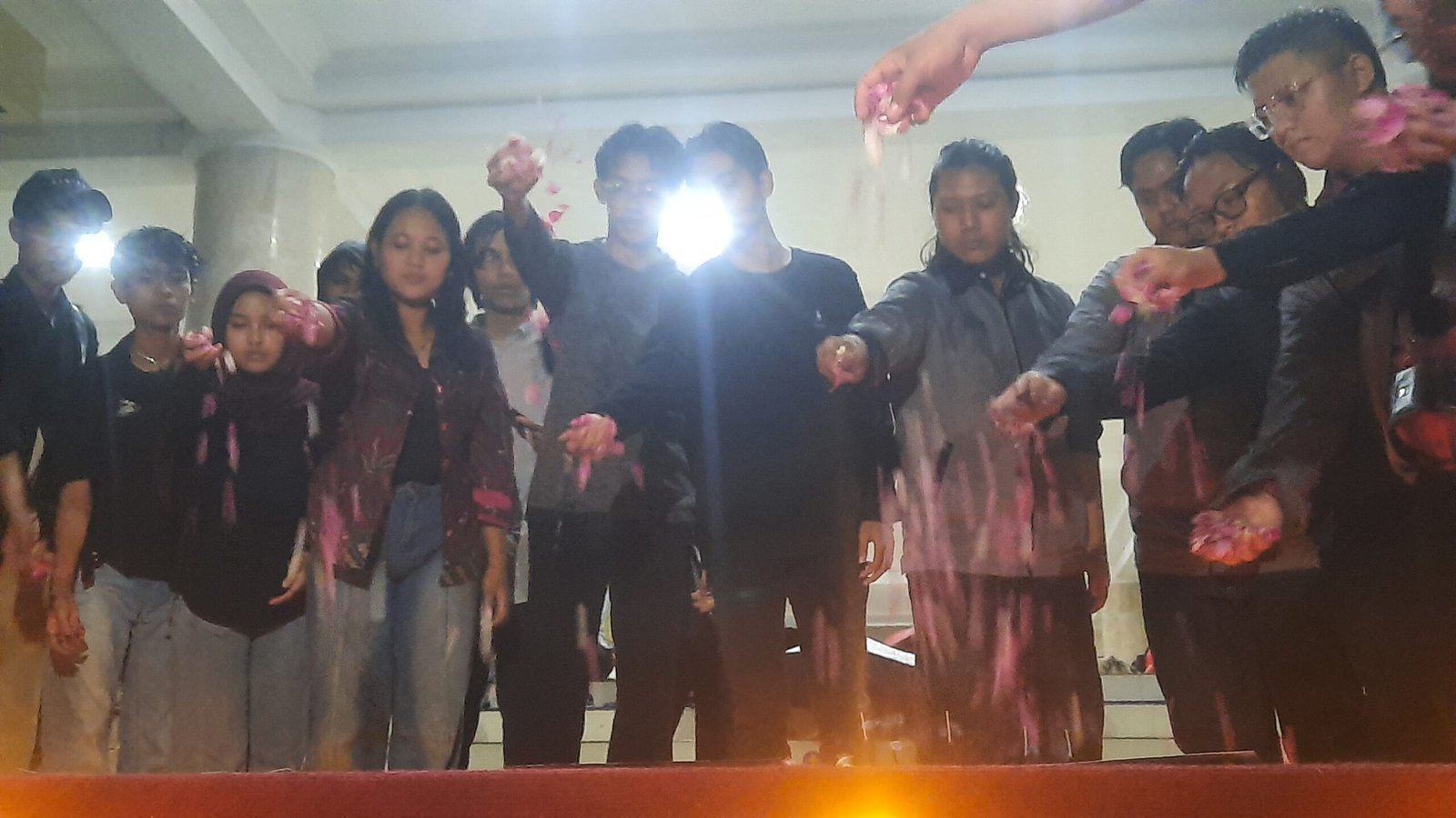 Mahasiswa UNY melakukan aksi tabur bunga sebagai solidaritas ditangkapnya Perdana Arie, Mahasiswa Fakultas Ilmu Sosial dan Politik (Fisip) di Depan Gedung Rektorat, Selasa (30/9/2025). [populi.id/Hadid Pangestu]