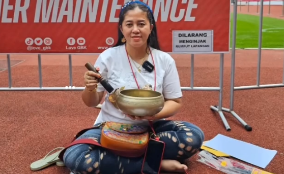 Dalam video viral berdurasi 27 detik, tampak sosok Mbak Rara berjalan di pinggir lapangan sembari melakukan ritual tolak hujan.