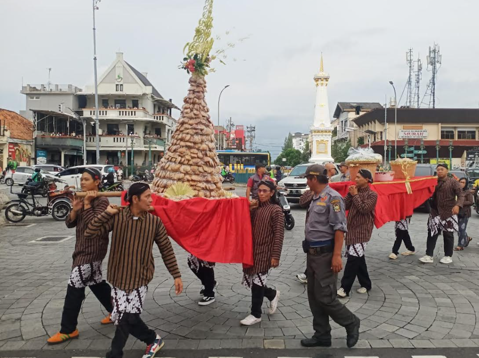 Warga Gowongan mengarak gunungan apem hingga nasi berkat dalam gelaran ruwahan sambut Ramadan, Sabtu (14/2/2026). [populi.id/Dewi Rukmini]